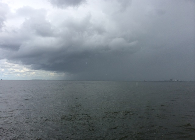 Een half uur later is het weer voorbij. De wind valt weer weg, de zon komt achter de bui te voorschijn en de temperatuur schiet omhoog. We moteren het laatste stukje en maken weer vast in onze thuishaven. Later die dag trekt een zeer zware bui over Limburg en Duitsland, waar vijf mensen omkomen door vallende bomen.